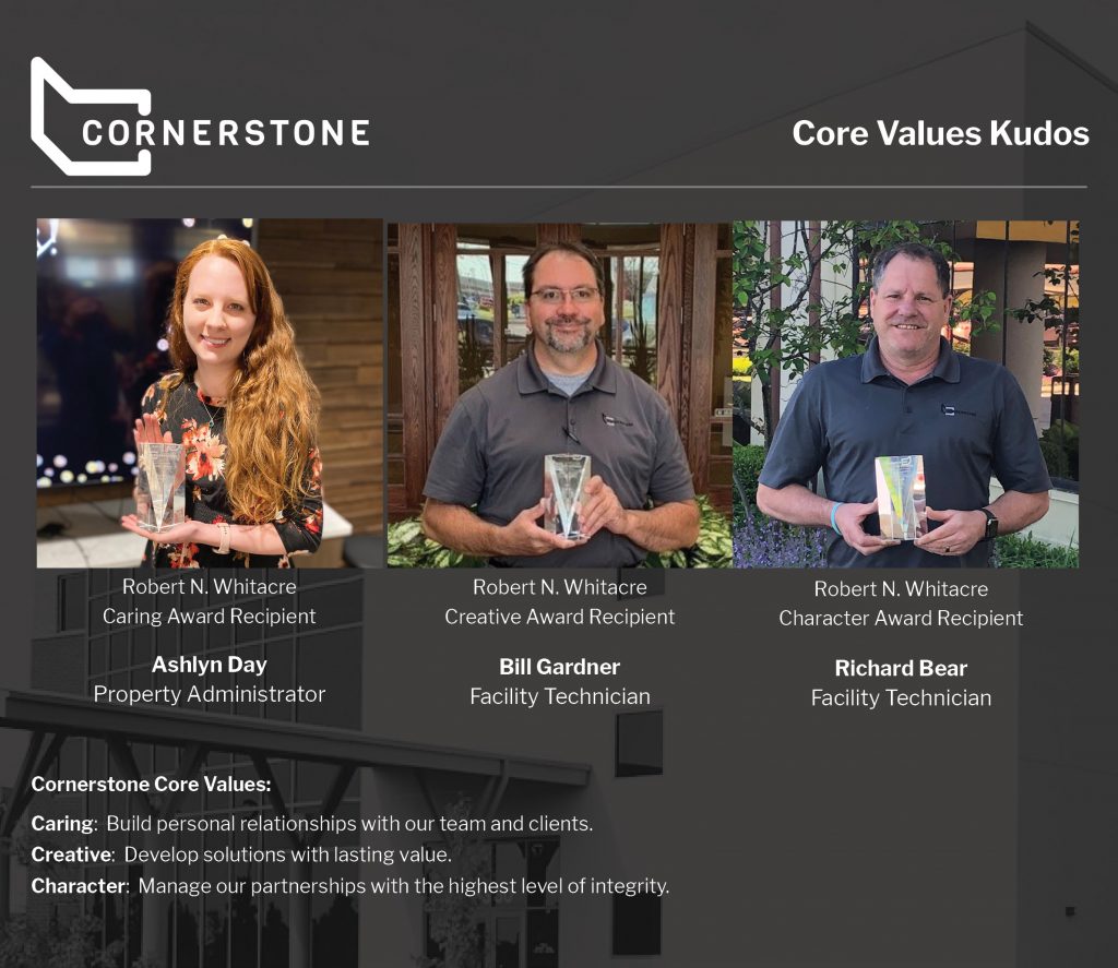 35 years ago Bob Whitacre founded what is now one of the largest, fully-integrated healthcare real estate firms in the country, Cornerstone Companies, Inc. At Cornerstone, We hold our fundamental beliefs and principles as core values that guide us and shape our culture. In honor of Bob, each year we award 3 team members with our annual Robert N. Whitacre Core Values Awards. Our Core Values are: