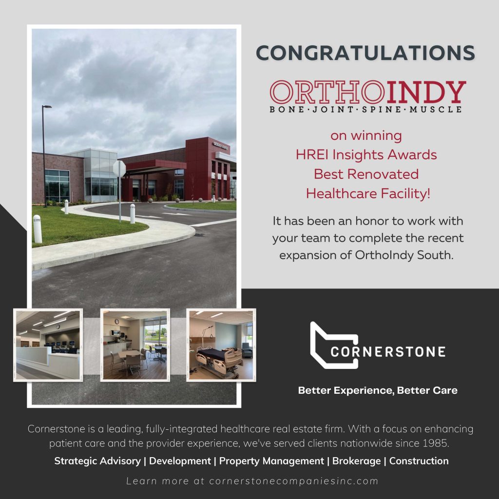 After completing a 17,250 SF in-patient unit expansion at OrthoIndy South we submitted the project for consideration for the HREI Insights Awards. We were thrilled to find out the project won its category – Best Renovated Healthcare Facility! The HREI Insights Awards are the first and only national awards dedicated to recognizing excellence in the areas of healthcare real estate development and executive leadership.