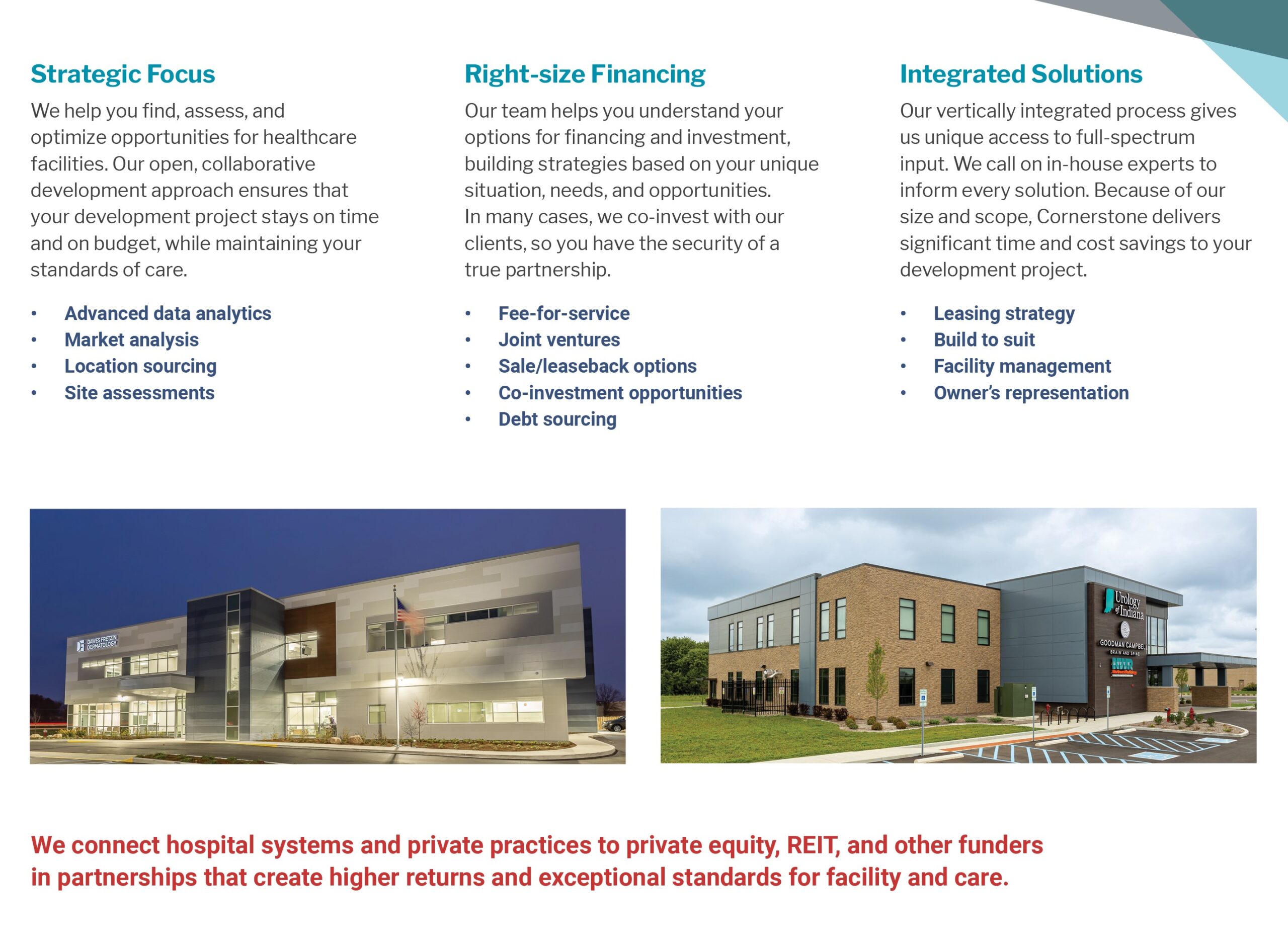 As one of the nation’s largest integrated healthcare real estate groups, Cornerstone develops facilities that maximize value while improving patient care and satisfaction. We partner with more than 600 physician and hospital groups nationwide to help them navigate the complexity of real estate ownership and profitability.