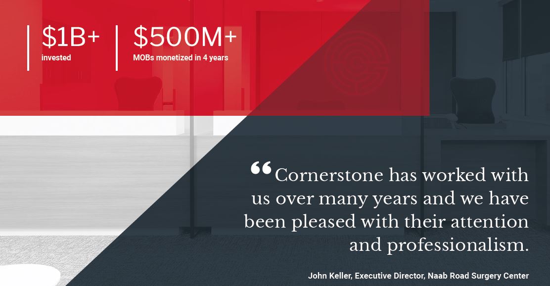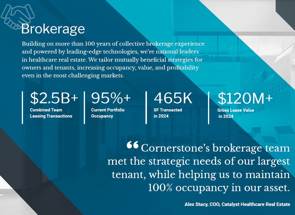 As one of the nation’s largest integrated healthcare real estate groups, we deliver data-driven strategies with relationship-based service to our healthcare clients. Cornerstone helps physicians, hospitals, and third-party owners across the nation develop, build, lease, manage, and maximize their investment in healthcare real estate while enhancing the patient and provider experience.